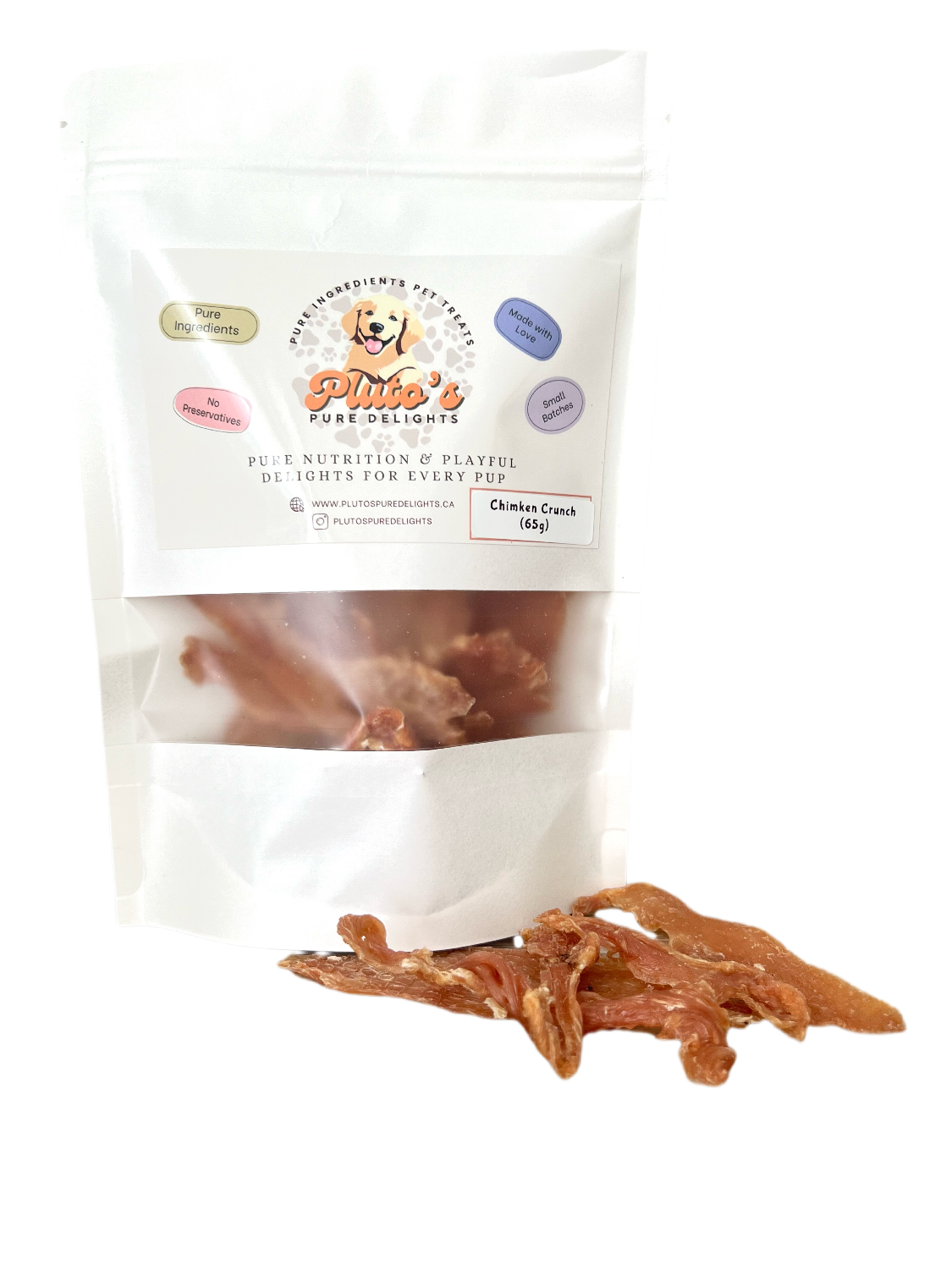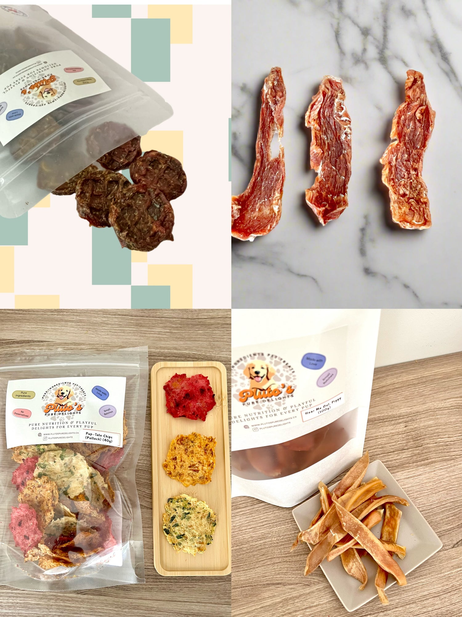 Human-grade, pure ingredients, no preservatives, small batches, dehydrated pet treats made with love