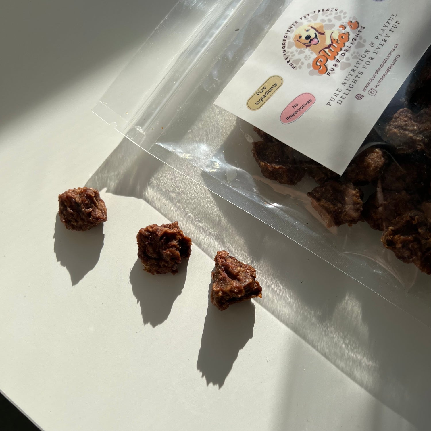 Human-grade, pure ingredients, no preservatives, small batches, dehydrated pet treats made with love